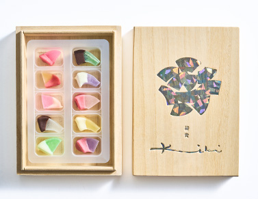 桃・ミント・レモン・すみれ・オレンジ、五種の寒天菓子に、