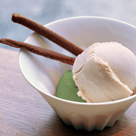 バニラアイスに香ばしい素焼き素麺を添え、